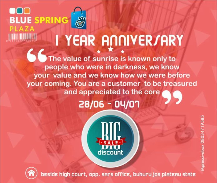 The company is using the medium to say thank you to her various customers for their patronage this one year in existence. In the light of this celebration,BLUESPRING shopping plaza is also giving amazing discounts and a wide range of goods and commodities.