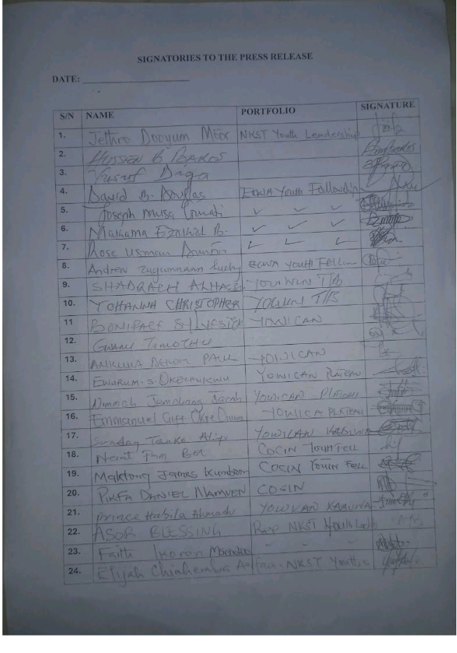 The youths said many victims had been killed, displaced, kidnapped, or subjected to rape and abduction, while minors were being forcefully converted. They also pointed to systemic discrimination, citing the denial of civil service opportunities, refusal to implement gazetted chiefdoms such as the Zaar Chiefdom in Bauchi State, and imposition of non-indigenous leaders on Christian-majority communities.