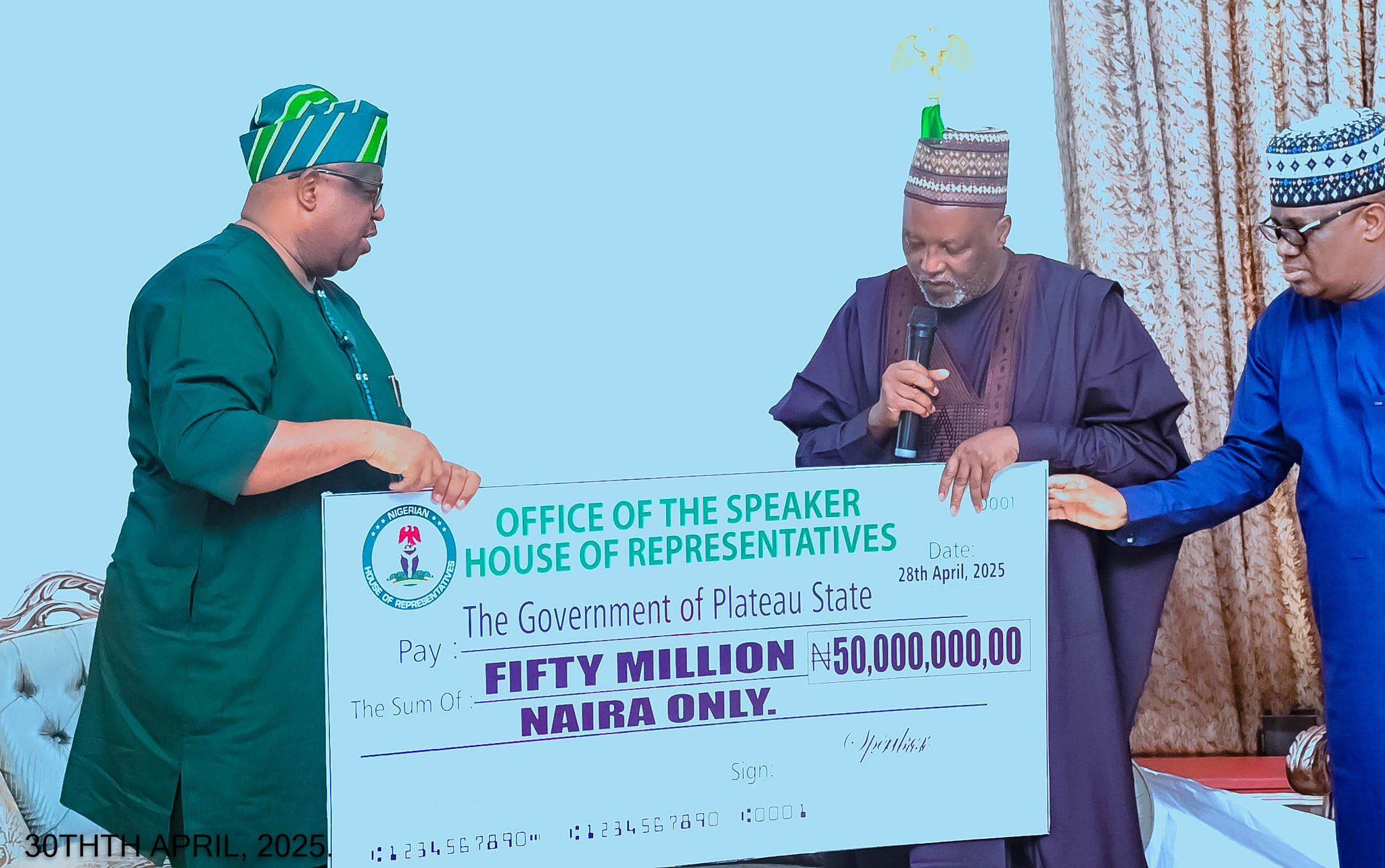 A delegation of federal lawmakers, led by former Deputy Speaker Rt. Hon. Idris Wase, presented the donation on behalf of the Speaker, Rt. Hon. Tajudeen Abbas. The lawmakers, all from Plateau State, were mandated by the Speaker to visit the state and express condolences to the government and people over the tragic incidents.