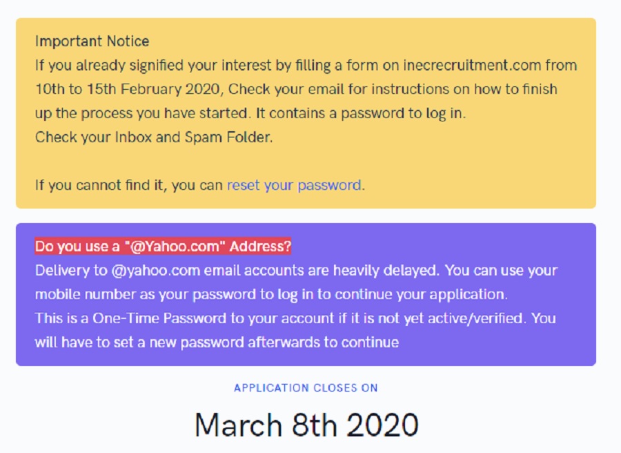 The recruitment which started on 10 February was supposed to close March 1st but according to the latest information on the INEC recruitment website the closing date is now Sunday the 8th of March 2020.