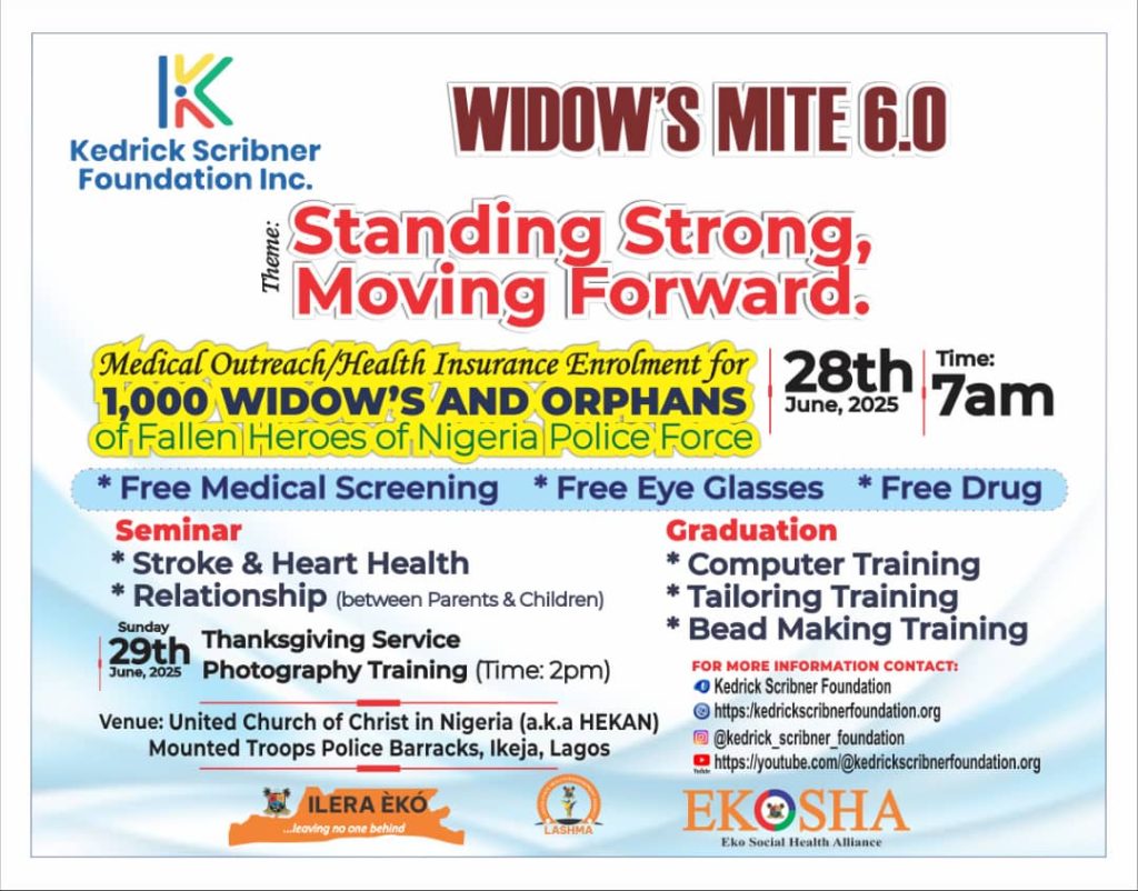 The Kedrick Scribner Foundation Inc., in collaboration with Eko Social Health Alliance (EKOSHA) and ILERA EKO, is proud to present Widow’s Mite 6.0, a landmark outreach program themed “Standing Strong, Moving Forward.” This year’s edition is set to bring life-changing impact to over 1,000 widows and orphans of Nigeria Police Force heroes who paid the ultimate price in service to our nation.