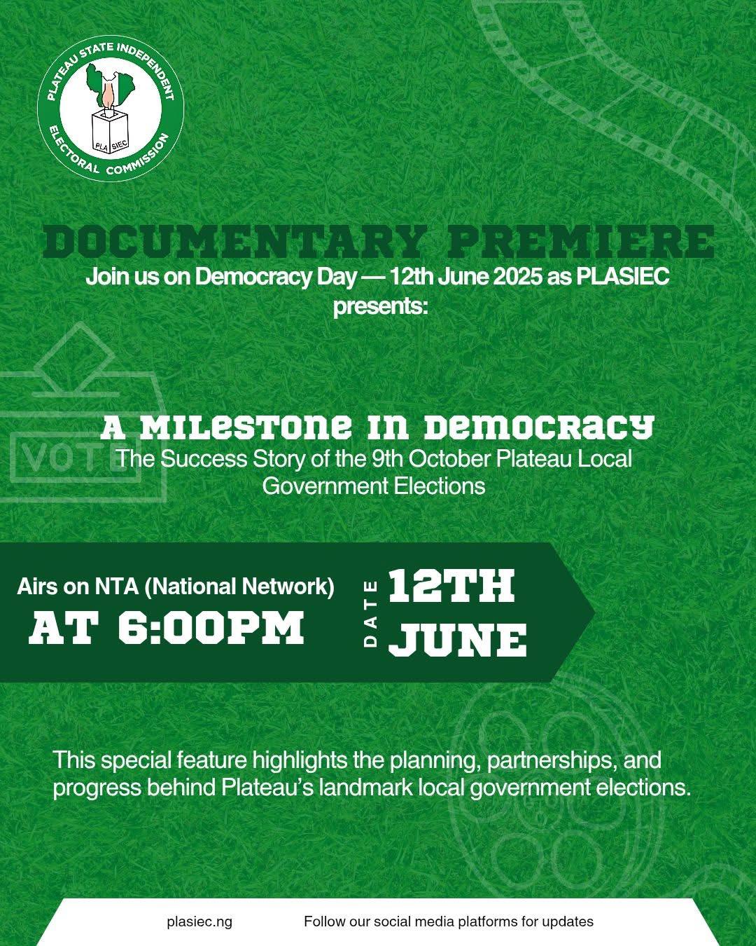 Plateau State, Nigeria – June 12, 2025 — The Plateau State Independent Electoral Commission (PLASIEC) is set to premiere its highly anticipated documentary titled “A Milestone in Democracy: The Success Story of the Plateau 9th October Local Government Elections” on the national network of the Nigeria Television Authority (NTA).